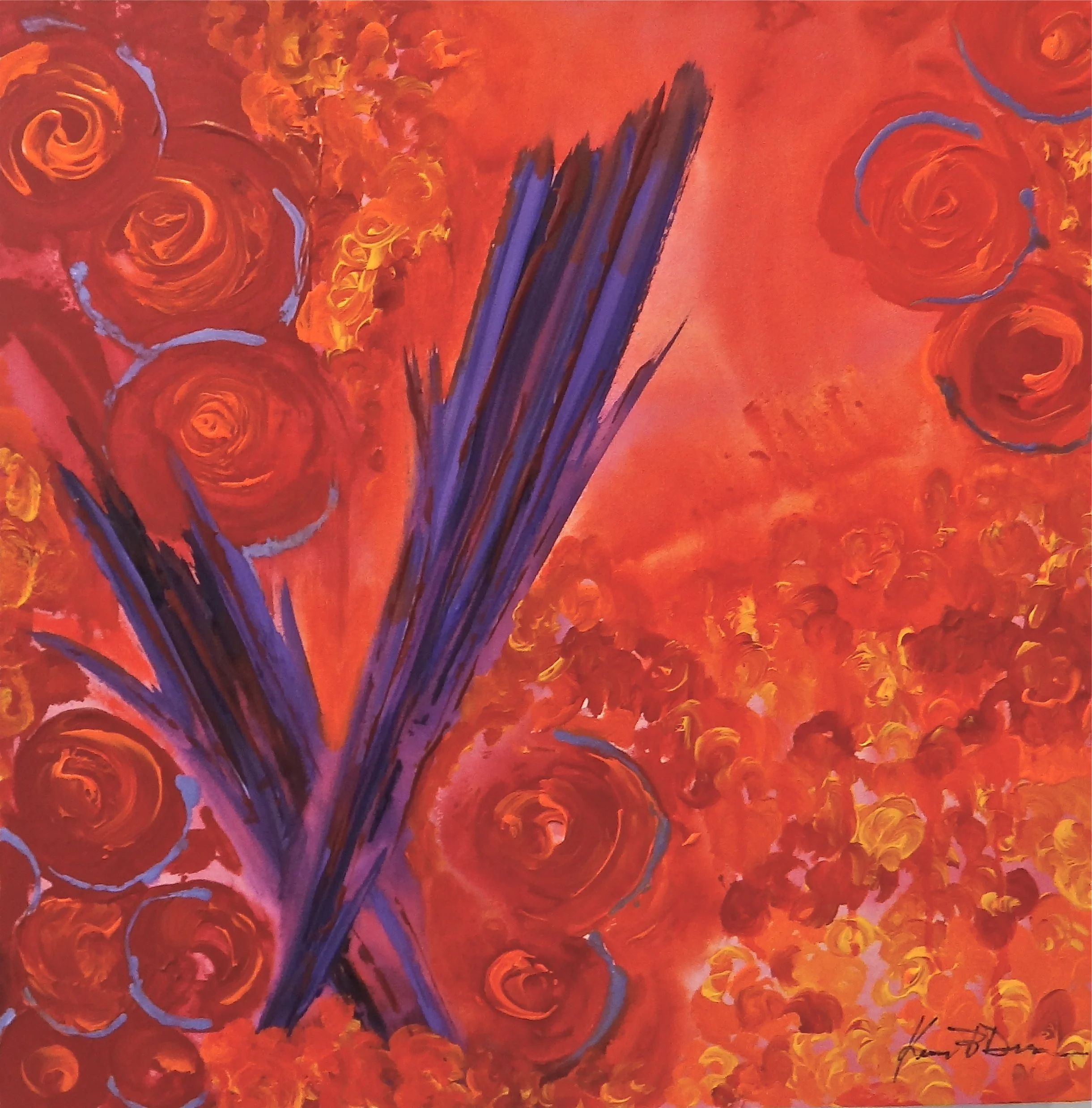 24"x 24"x 3" Straw Flowers, Acrylic on canvas. Story: a floral arrangement with red, and orange and complemented with purple and metallic lavender.