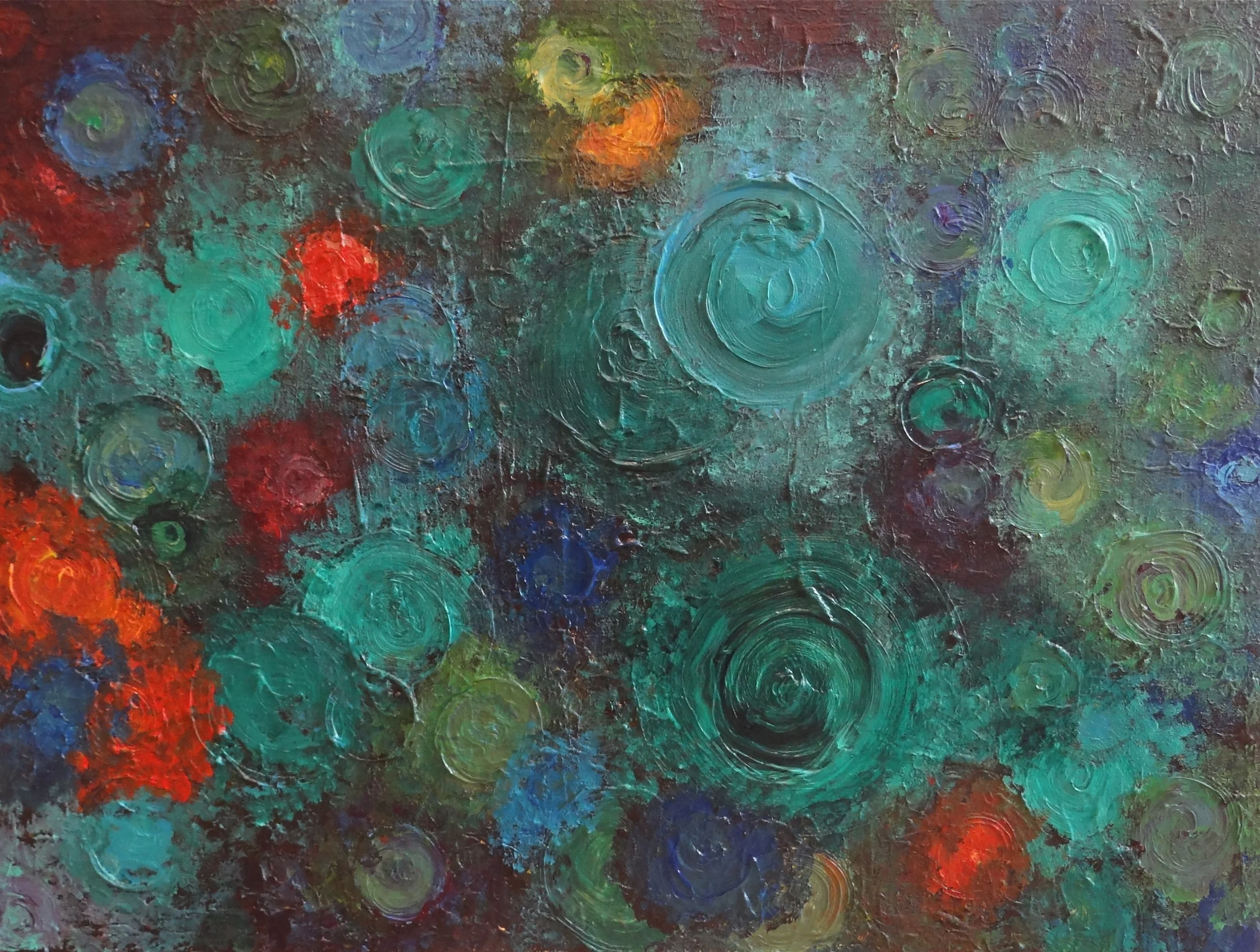 48" x 60" x 2" Forces of Nature The motivation of this painting is a giant ocean wave pounding in on the sand. Heavy texture and vivid blue and green colors with a touch of contrasting orange and black.